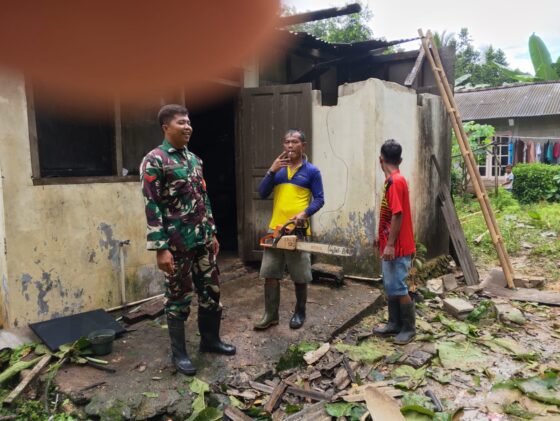“Kami mendatangi TKP untuk membantu meninyingkirkan pohon tumbang yang menimpa rumah bapak Miswadi tersebut dengan bergotong royong, “kata Babinsa.